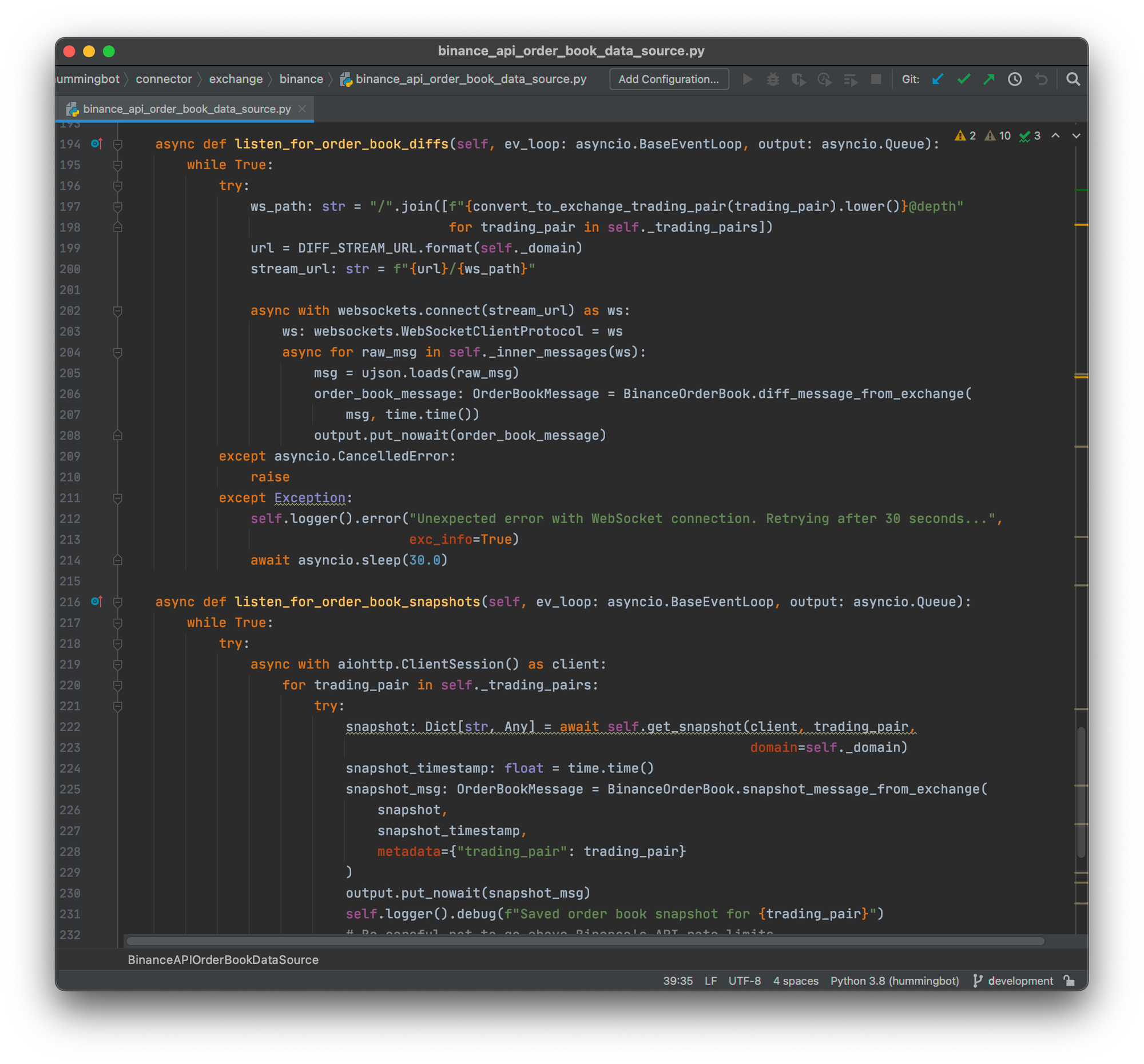 Hummingbot market connectors are designed to use the lowest latency data source, which is web socket on most centralized exchanges, that is available. Let's take a look at the Binance market connector as an example again. Specifically, let's take a look at the BinanceAPIOrderBookDataSource in hummingbot.connector.exchange.binance.binance_api_order_book_data_source.