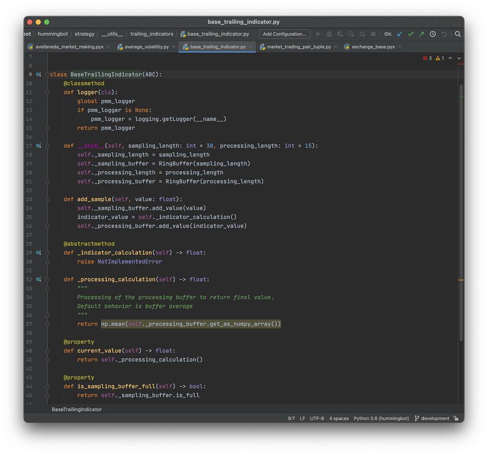 Sophisticated strategies often need some trailing indicators from the market, in addition to the current prices or order book depth information, to make trading decisions. This includes most of the technical analysis indicators such as EMA, MACD and Bollinger Bands. In Avellaneda & Stoikov strategy example, the object self._avg_vol, which is an instance of AverageVolatilityIndicator, is a trailing indicator for recent price volatility.