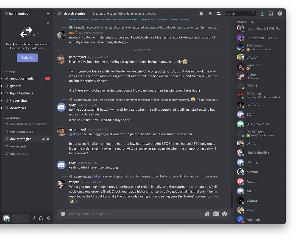 Our Discord server is a good place you can find other Hummingbot developers, who, like you, may be creating their own strategies, indicators and market connectors. We have several developer oriented channels, where you can get community support on how to create your own modifications to Hummingbot.