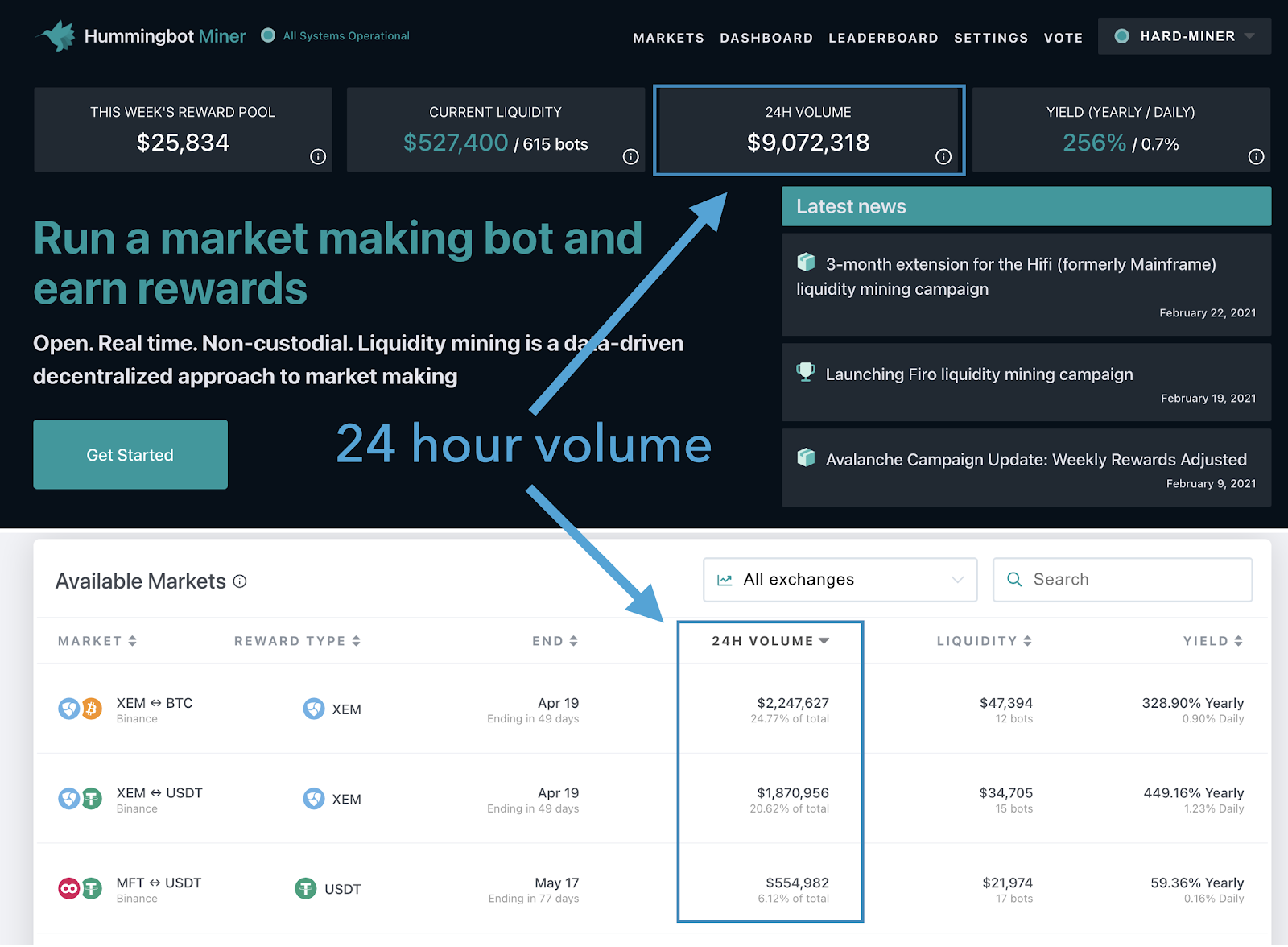 The app now shows the last 24h traded volumes generated by our miners. This metric shows the amount of our Hummingbot miners’ maker orders (order book depth) that have been filled. This represents the amount of trading that has benefitted from the order book depth provided by Hummingbot miners.