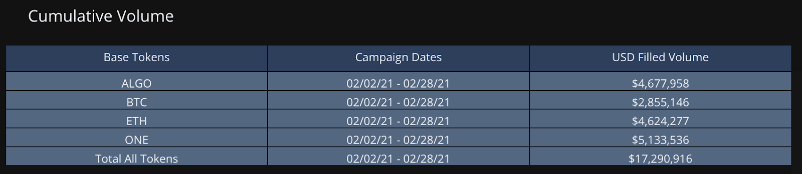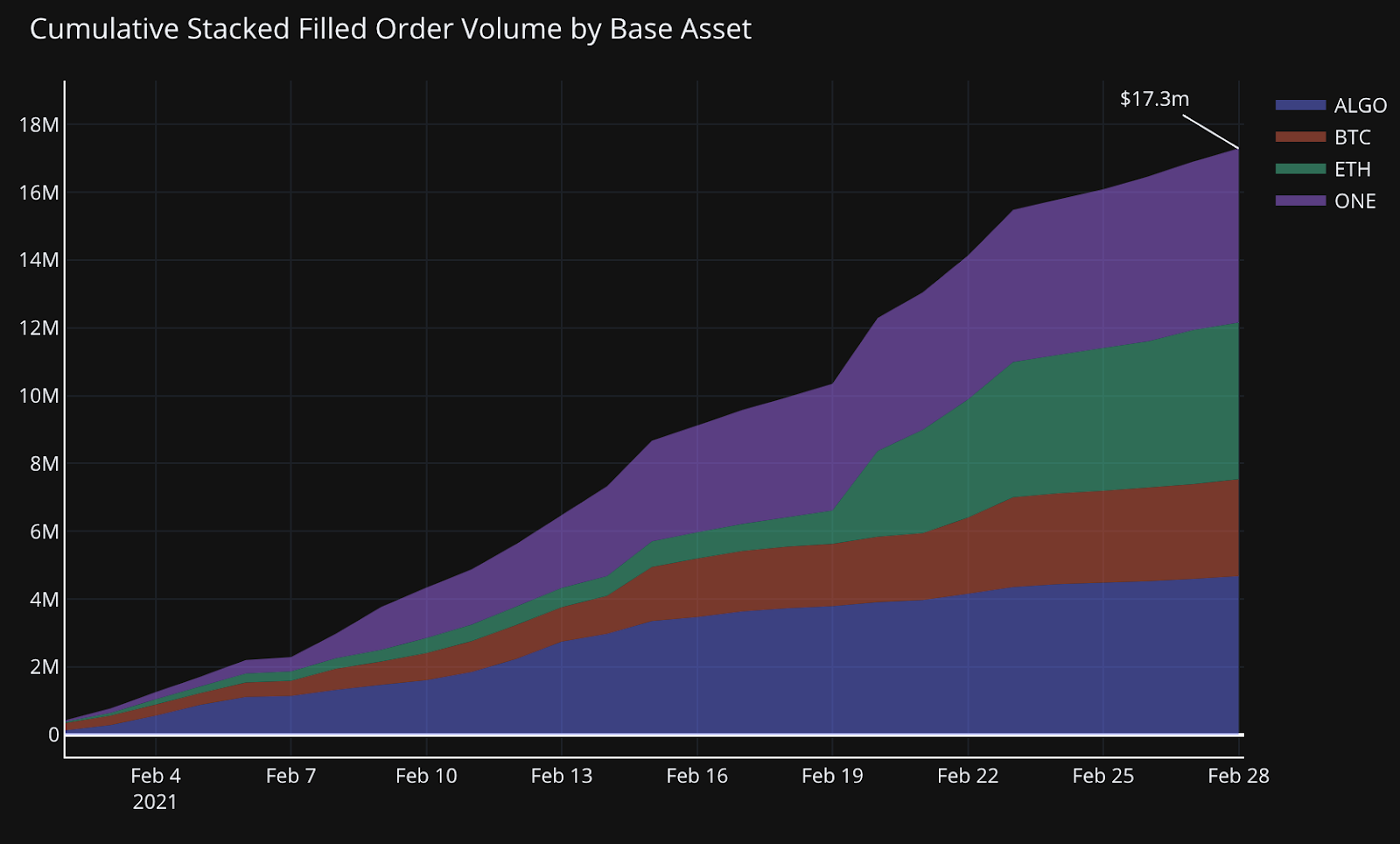 Hummingbot Miners were accounting for a meaningful amount of volume for Harmony ONE and Algo for the month, as much as 87% and 25%, respectively: