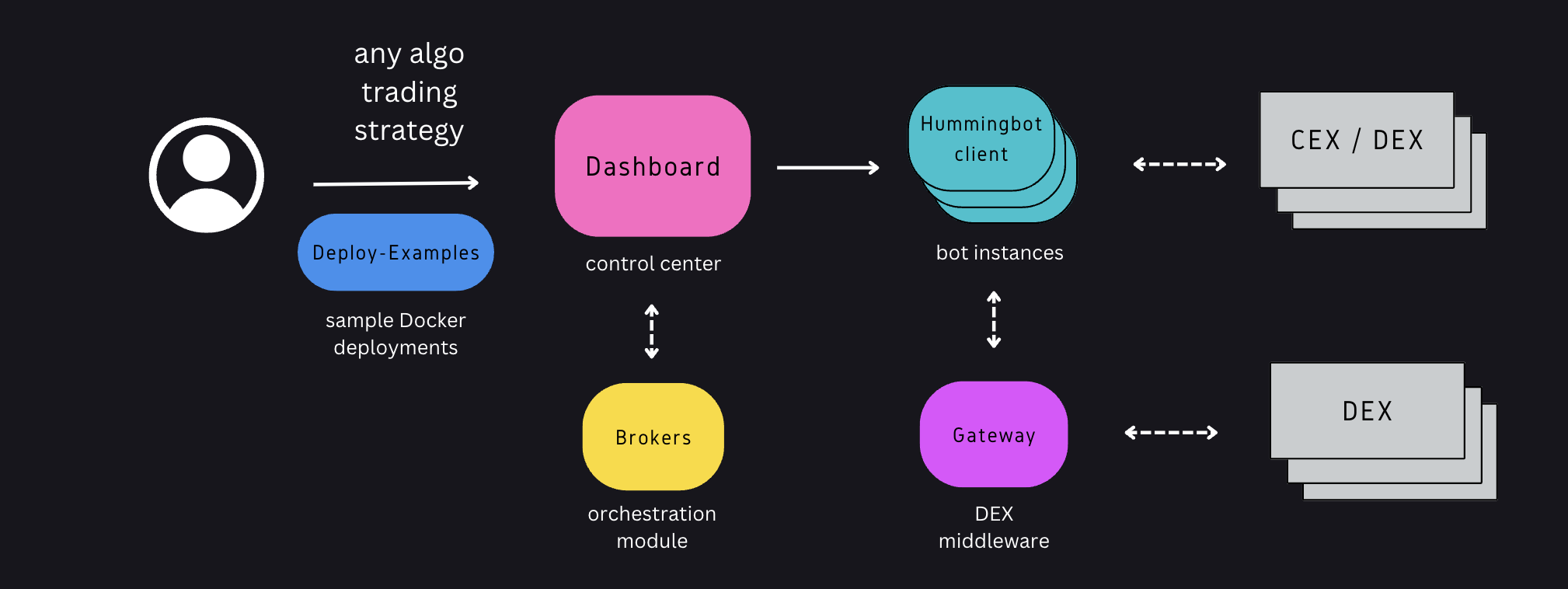 These five repos work together to let users deploy and use Hummingbot however they like. For example, an individual user may just run a single market making bot instance alongside the stock dashboard that analyzes its performance. Meanwhile, a trading firm can use the same stack to deploy multiple bots, each running its own custom strategy, and analyze their aggregate performance with a custom dashboard.