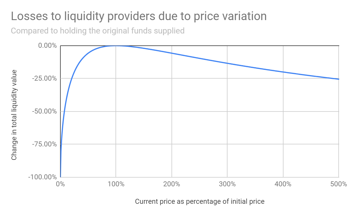 Once trading occurs resulting in prices moving up or down (movement along the x-axis), the total value of locked tokens will go down, no matter the price direction, following the path of the curve. Only if price eventually reverts to the original price when tokens were deposited will the liquidity provider return to breakeven.
