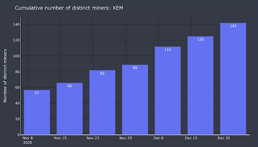 We saw consistent growth in the number of unique miners and open order volume committed to providing XEM token liquidity.