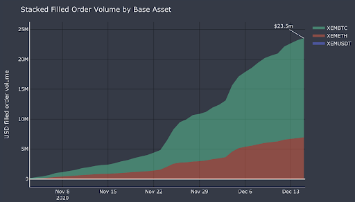 - As of December 15th, **liquidity miners accounted for ~US\(23.5mm of filled order volume**, an average of ~US\)4mm of weekly volume while paying average weekly rewards of only XEM 13,800