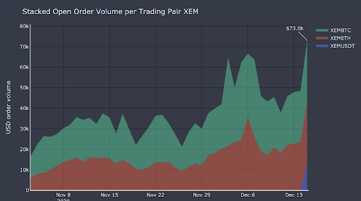 - Open order book volume created by miners peaked at US\(43K for the XEM/BTC pair and US\)36K for the XEM/ETH pair while the total current volume of the three eligible pairs is ~US$73K fter the first day of adding the new trading pair XEM/USDT, showcasing the cost effectiveness of this campaign to generate order book depth
