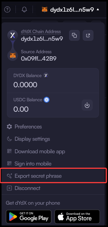 To export your secret passphrase, go to the wallet connection settings dropdown and click "Export Secret Phrase".