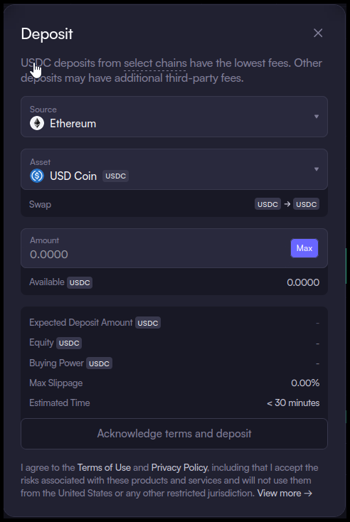 Once your wallet is connected, you will need to deposit USDC into your dYdX account. USDC is the required trading currency on dYdX.
