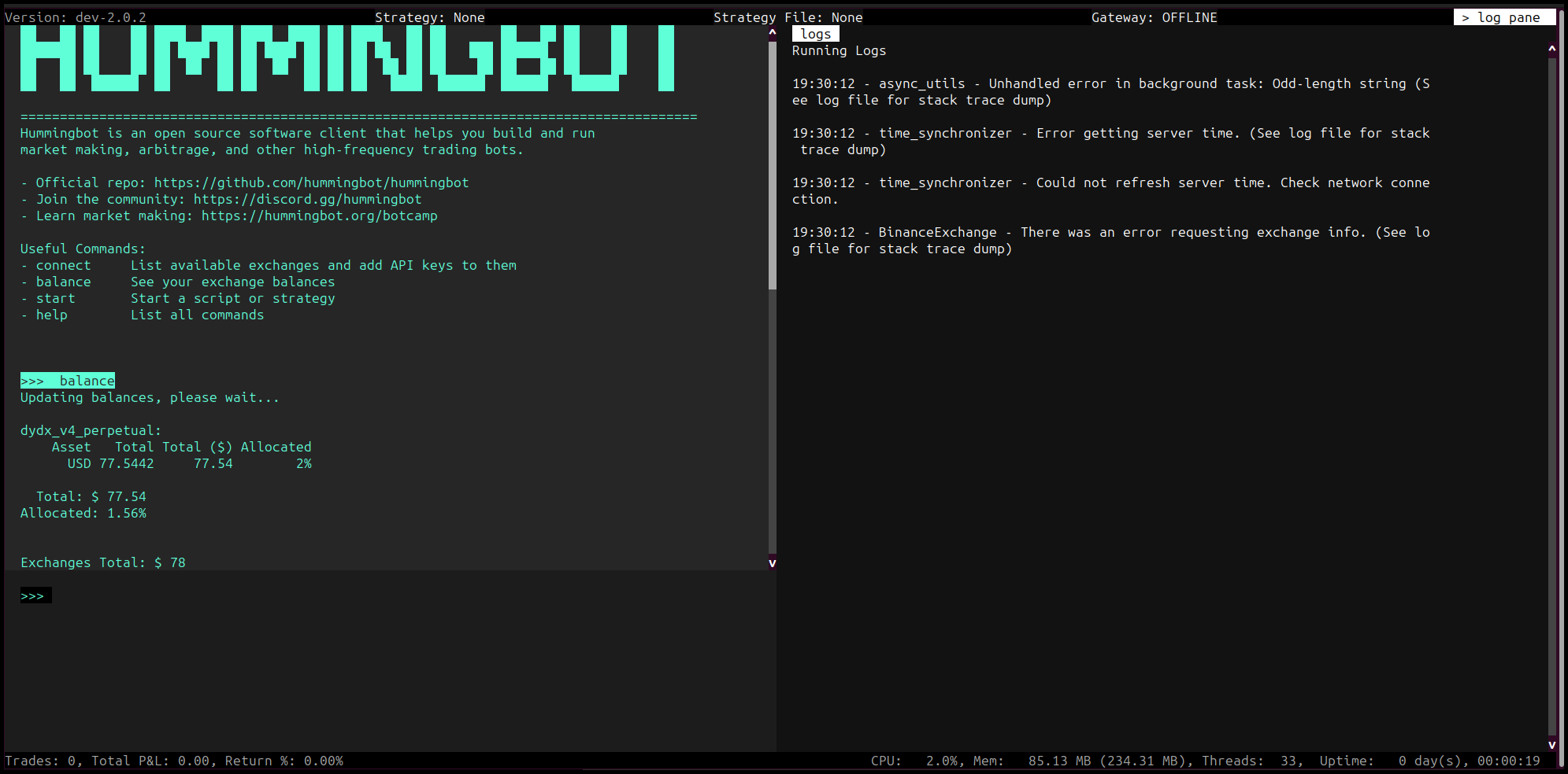 Hummingbot should now be running in the background. Use the following command to attach to the running instance:
