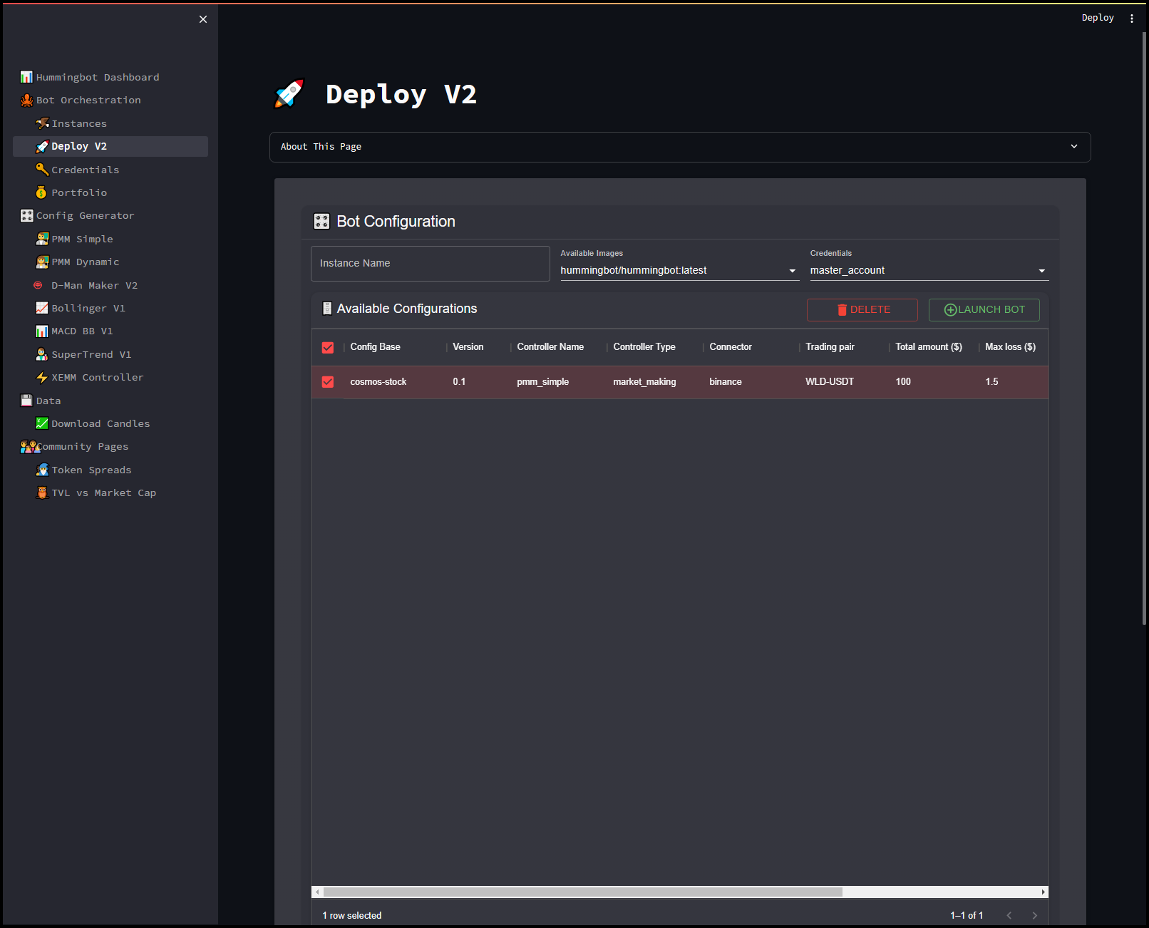 The Deploy V2 page in the Hummingbot Dashboard is designed for launching and managing Hummingbot trading instances. This page offers a streamlined interface to select configurations, set up instances, and deploy bots for automated trading.