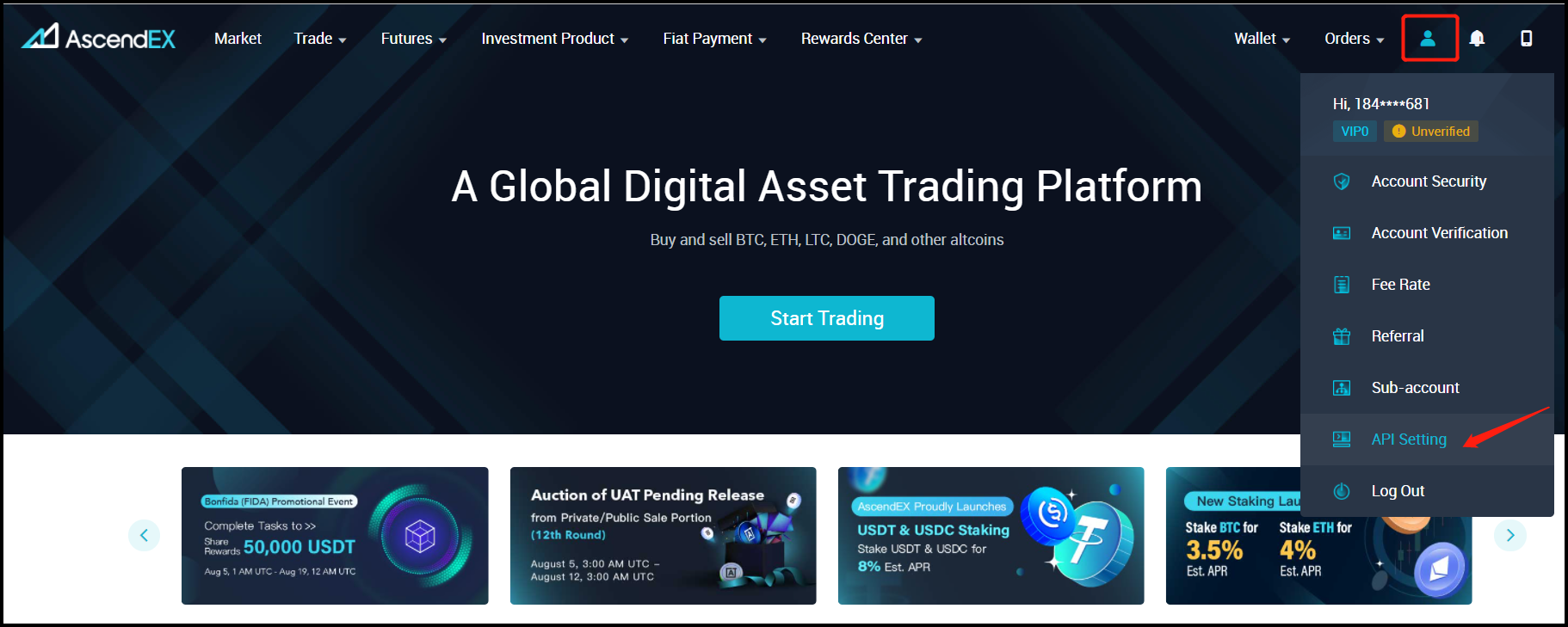Log in to your AscendEX account using your PC and visit profile icon – [API Setting].