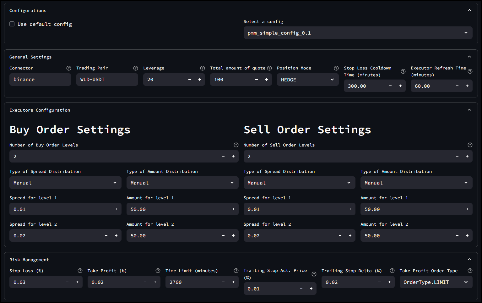 The PMM Simple V2 strategy places a symmetric grid of limit orders around the mid-price using your configured spreads. For example, a spread of 0.002 is interpreted as 0.2%. The total quote balance is automatically distributed across these levels—either equally or according to your custom weightings (buy_amounts_pct, sell_amounts_pct).