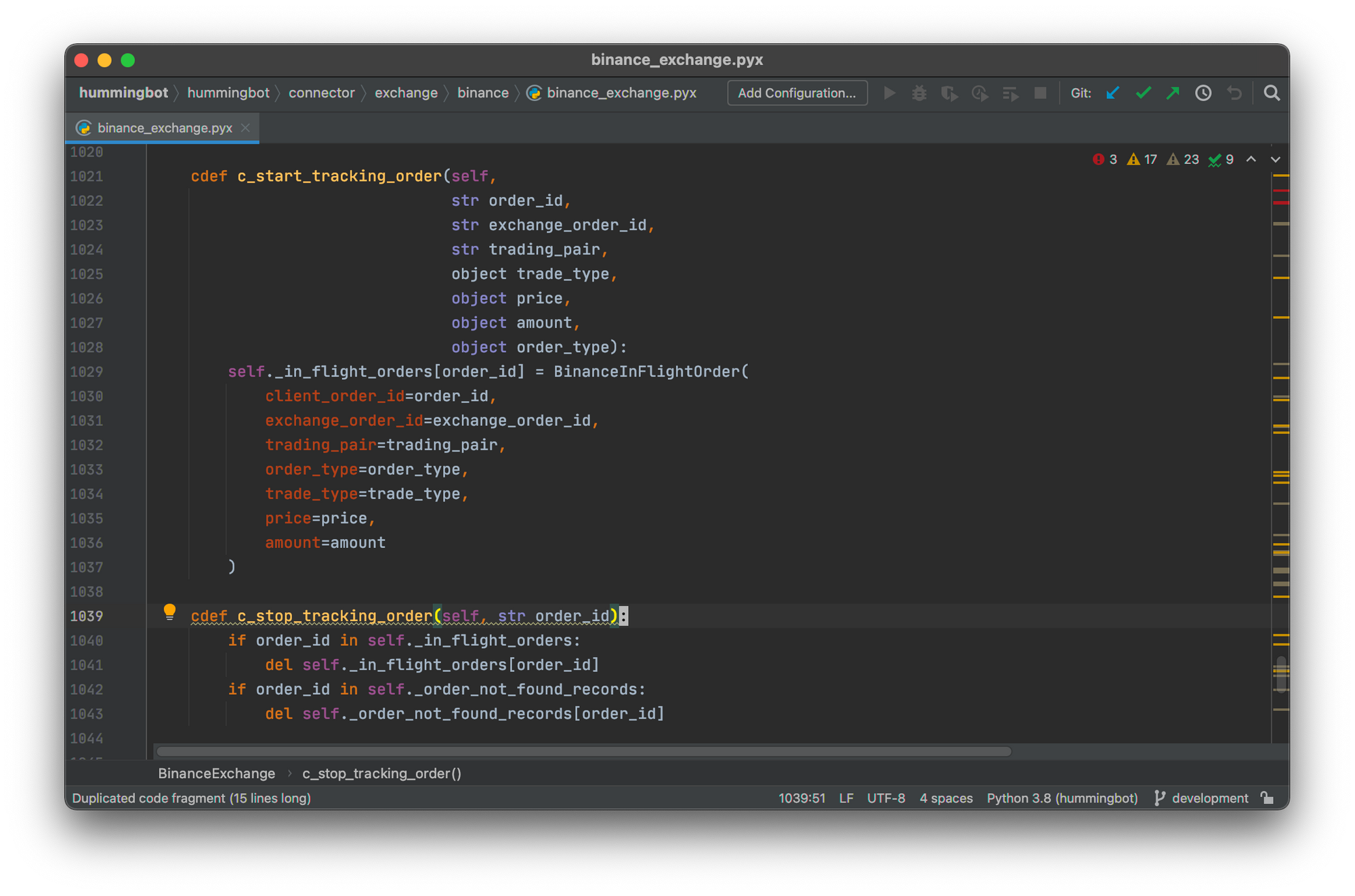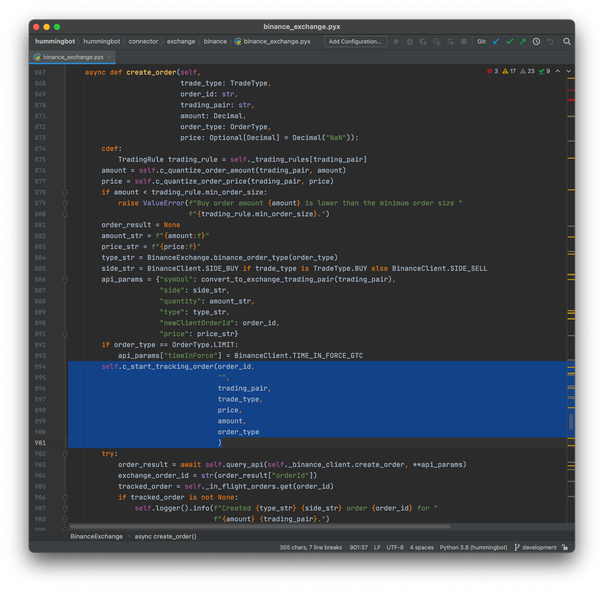 Since there is no guarantee the exchange API would give us a response to an order creation API call at the time - we have no reliable way of knowing whether the order has been placed or not in the market. If you look into the BinanceExchange.create_order() function, you'll find that the exchange connector starts tracking the order before it is submitted to the exchange API.