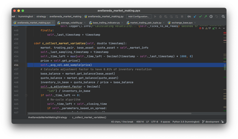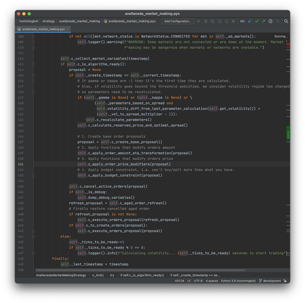 Let's take a look at the c_tick() function of the Avellaneda & Stoikov market making strategy in Hummingbot, below: