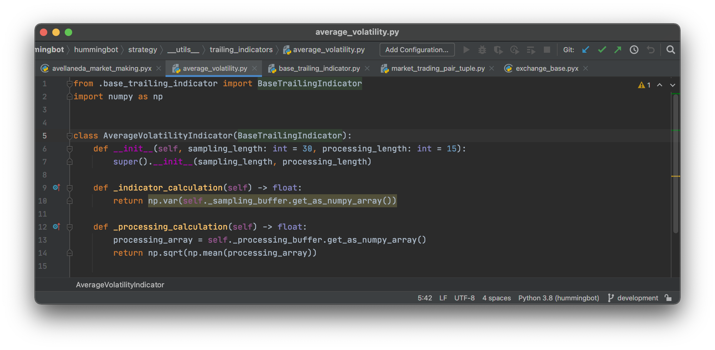 Sophisticated strategies often need some trailing indicators from the market, in addition to the current prices or order book depth information, to make trading decisions. This includes most of the technical analysis indicators such as EMA, MACD and Bollinger Bands. In Avellaneda & Stoikov strategy example, the object self._avg_vol, which is an instance of AverageVolatilityIndicator, is a trailing indicator for recent price volatility.