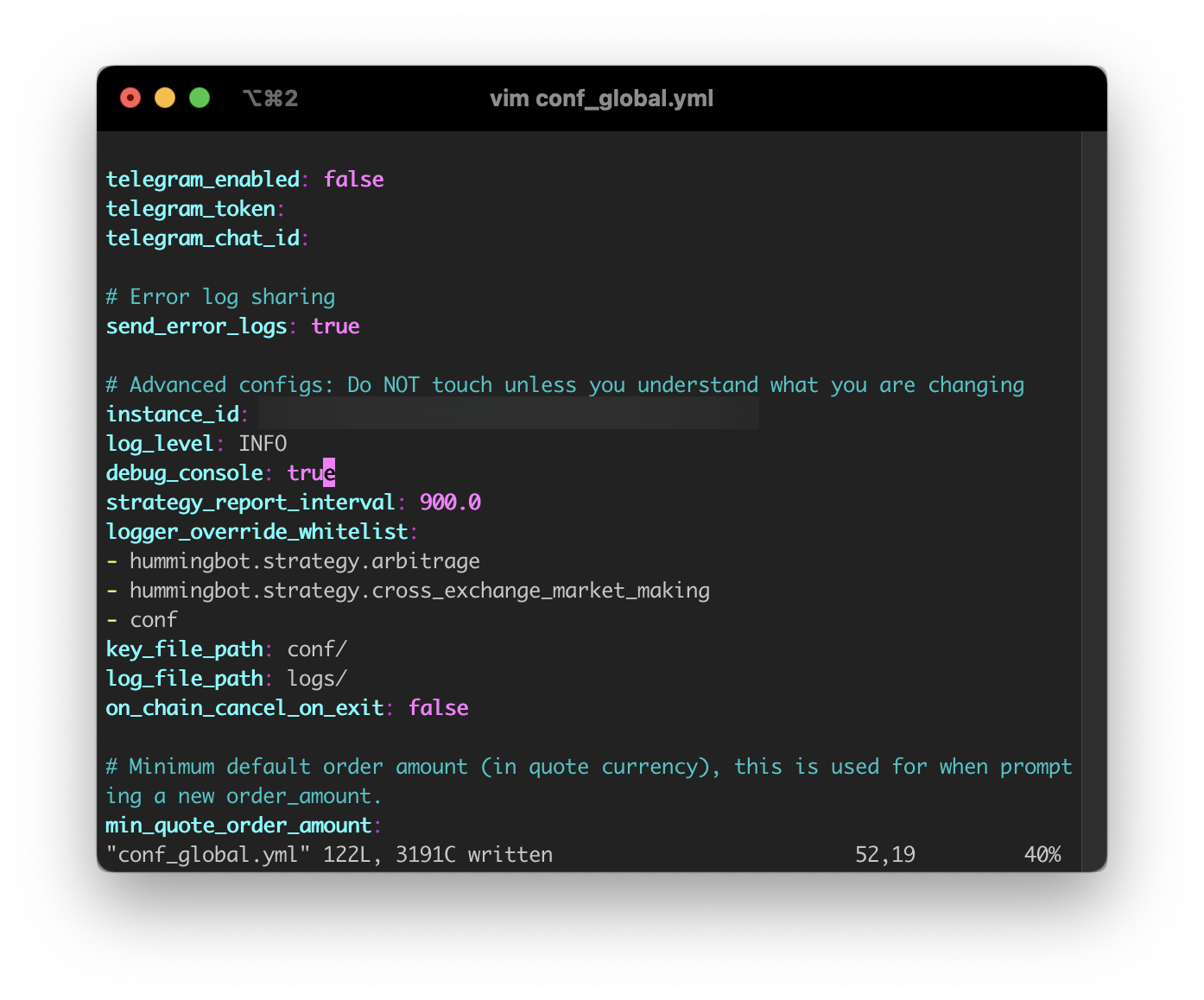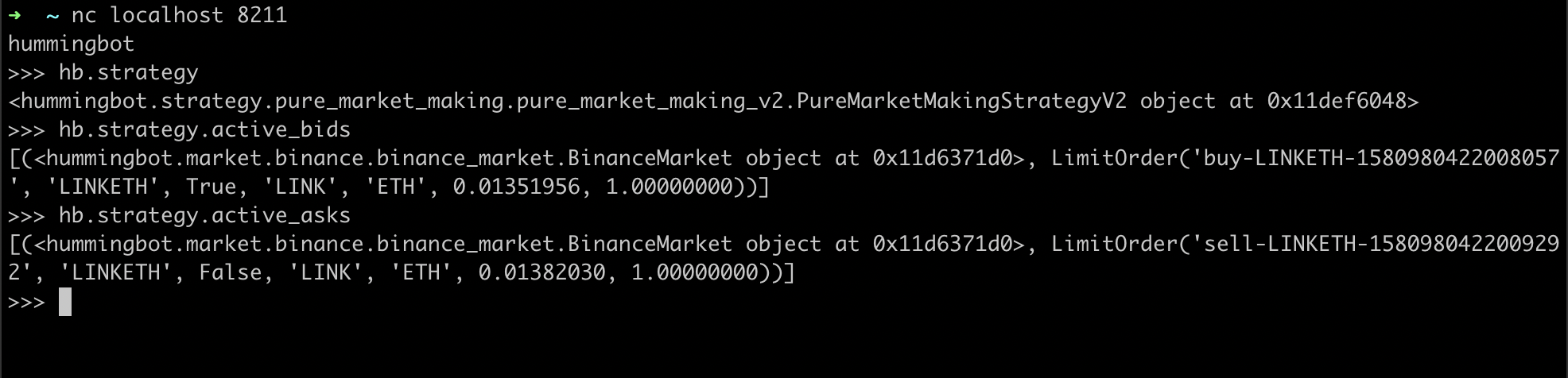 Once that has been set, you will be able to telnet to localhost:8211 to access an interactive Python console that has access to the same memory space as the live Hummingbot instance. You can, for example, examine the live properties from the currently running strategy object and look at the active orders it has made and is tracking.