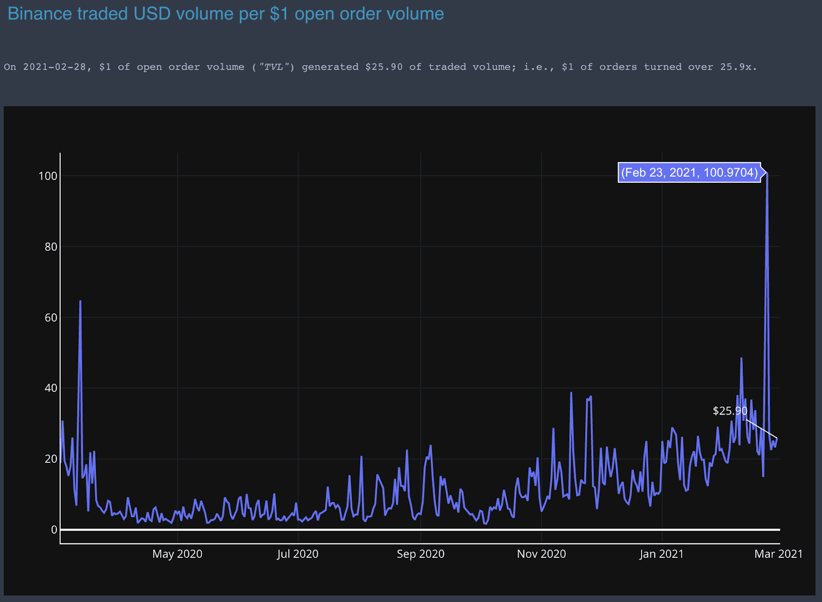 24h traded volume per $1 open order volume¶