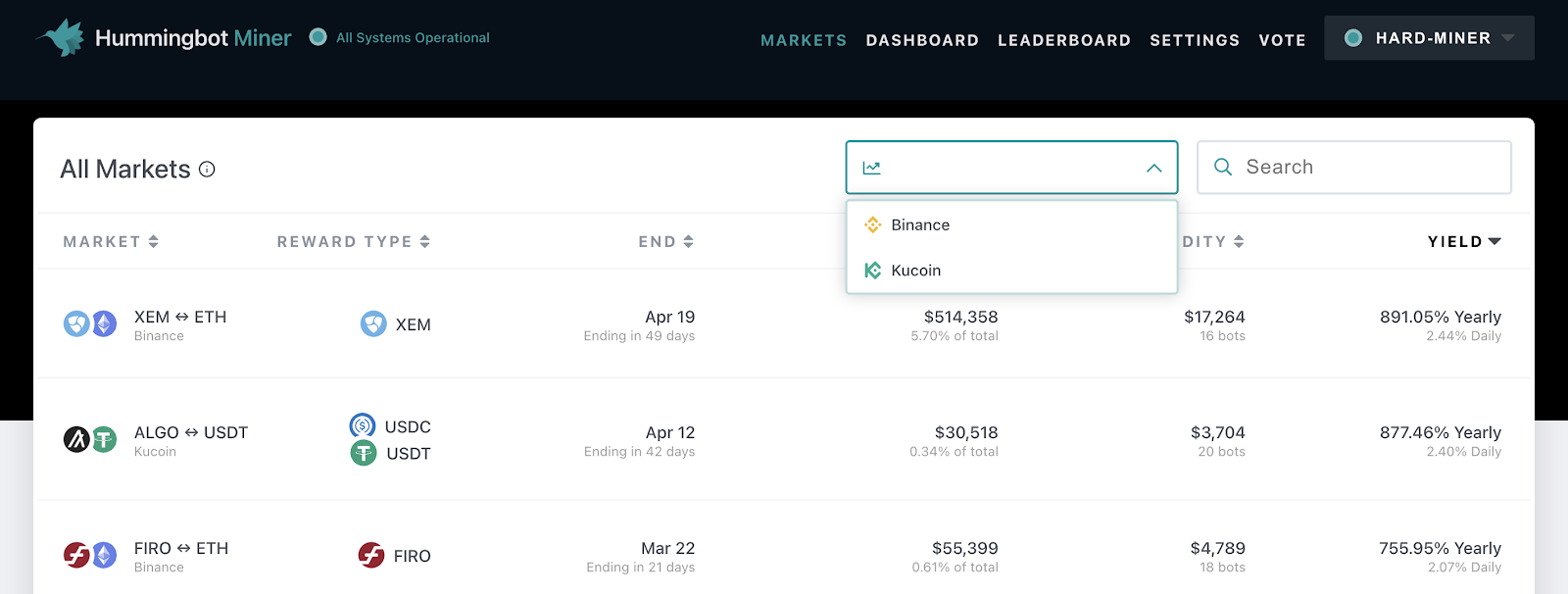 Since the launch of the Hummingbot Miner platform, miners have a cumulative trading volume of \(837m (\)819.8m on Binance and $17.3m on KuCoin):
