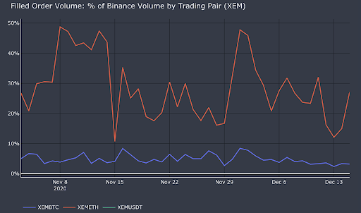 - As of December 15th, **liquidity miners accounted for ~US\(23.5mm of filled order volume**, an average of ~US\)4mm of weekly volume while paying average weekly rewards of only XEM 13,800