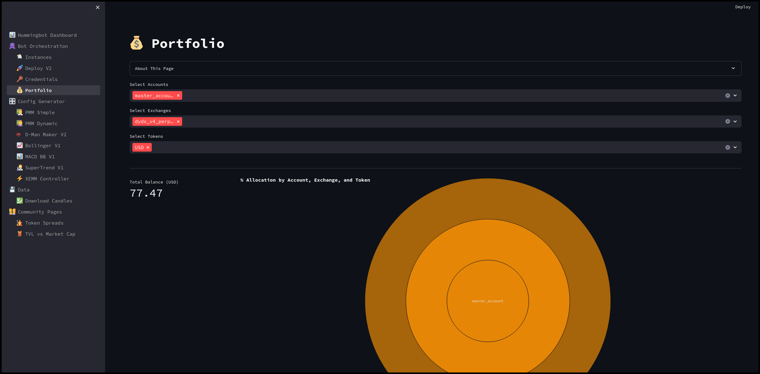 Hummingbot Dashboard is a web-based interface for Hummingbot introduced recently in Hummingbot 2.0 that allows you to perform backtesting, visualize your portfolio, and deploy/manage multiple bots. Since each bot is a Docker instance of the standard Hummingbot client, you can use the same credentials and API keys as the CLI method above.