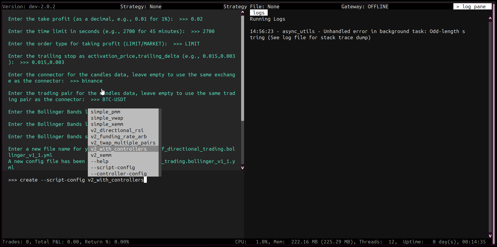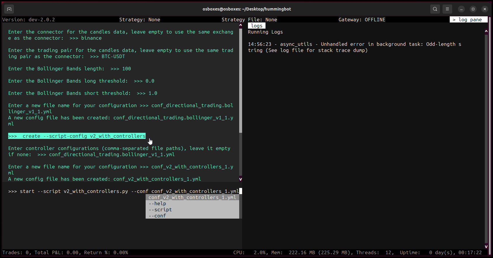 - When prompted for the connector with the candles data, make sure to select a different connector other than dYdX since it doesn't currently support candles feed.