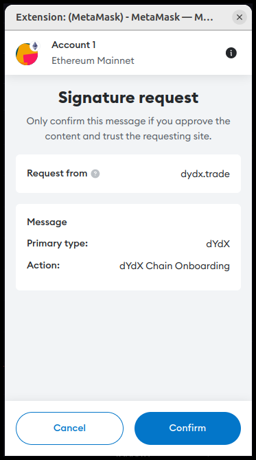 After the wallet is connected, dYdX will prompt you to sign a message to generate the dYdX Chain Wallet.