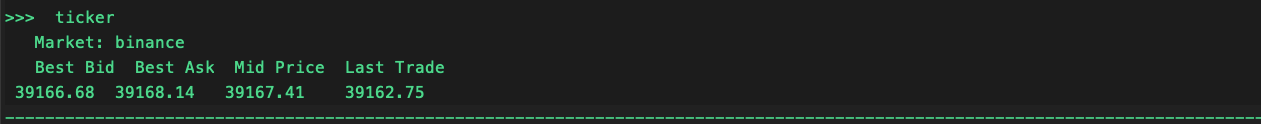 The ticker command displays the market prices, specifically the best bid, best ask, mid price, and last trade price.
