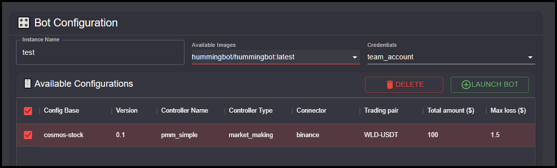 - Click on the Launch Bot button to start the bot with the selected configuration. The bot will begin trading based on the parameters and strategy defined in the configuration.