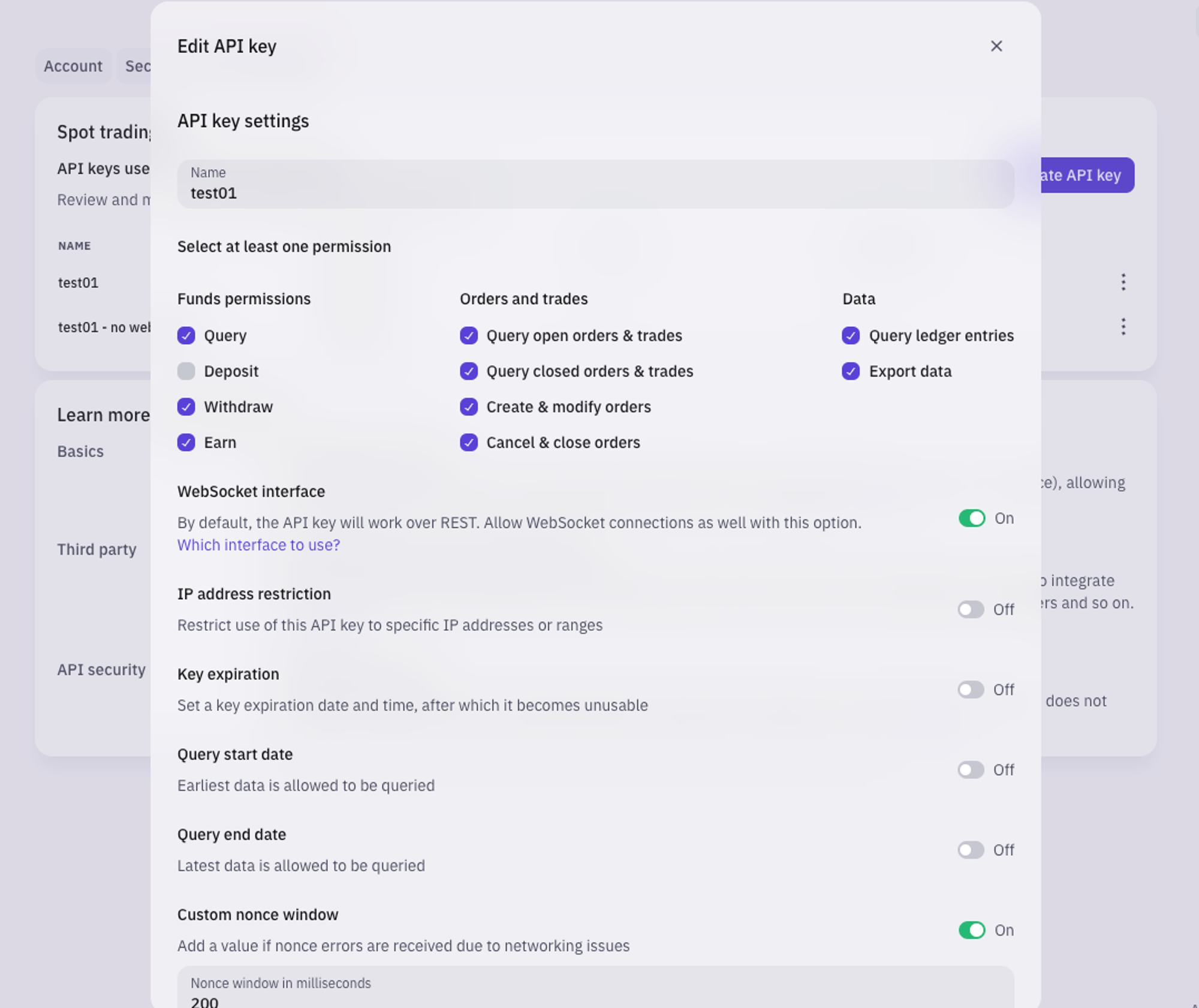 Ensure the Access Websockets connection box is on. This step is necessary to obtain an authentication token for the WebSocket APIs through the GetWebSocketsToken endpoint. Without this, the Kraken connector will be unable to reconstruct the order book and place trades. See Troubleshooting for an example of an error message in Hummingbot when this box is left unchecked
