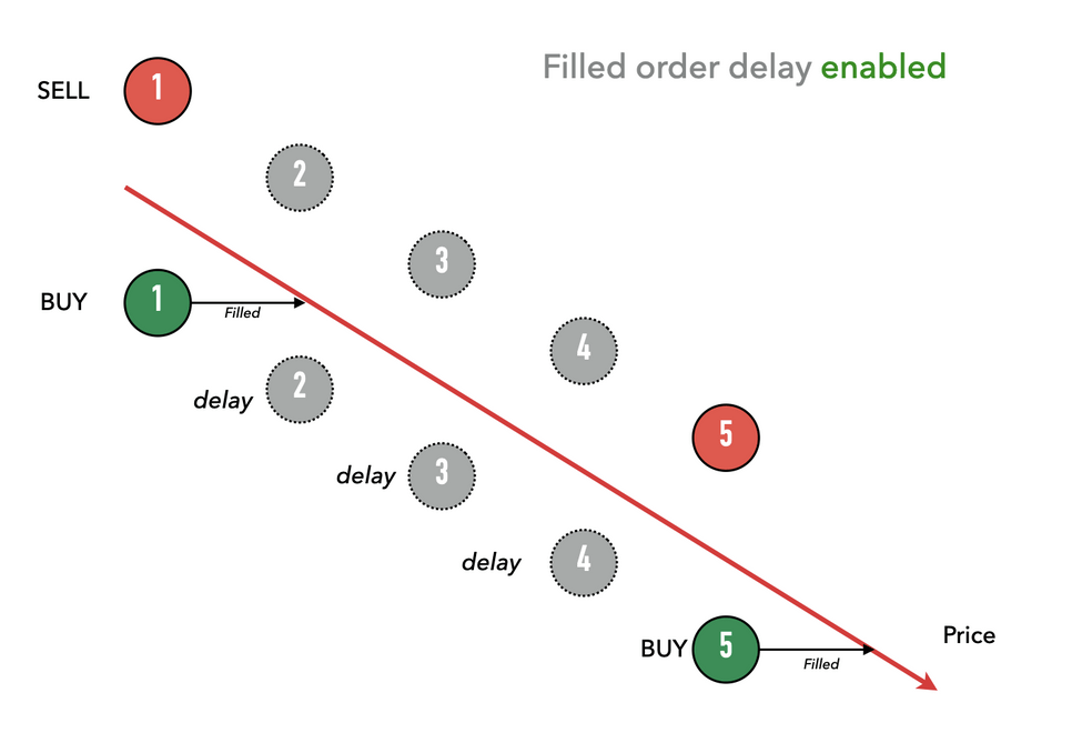 For example, with a filled_order_delay = 300 when an order created by the bot is filled, the next pair of orders will only be created 300 seconds later.